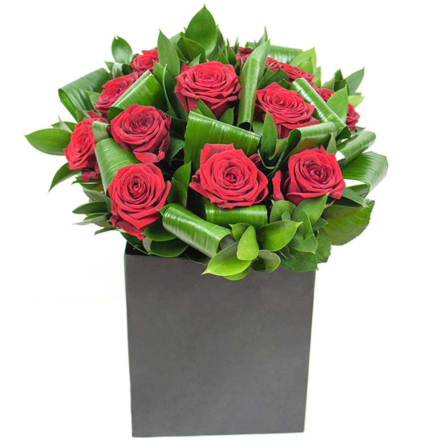 Enhance your decor with our elegant red rose bouquet, complemented by aspidistra leaves and ruscus. This unique arrangement brings style and sophistication to any room.